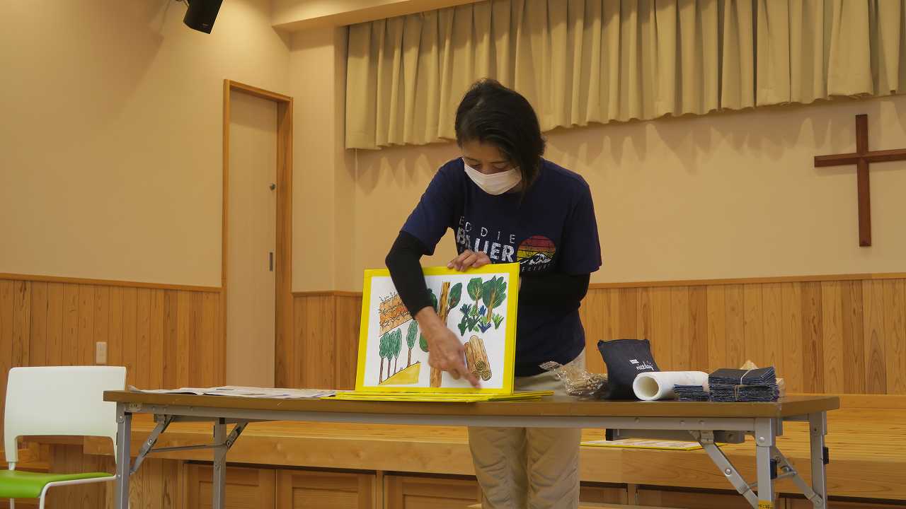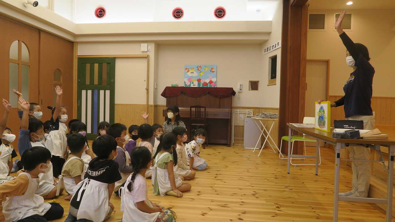 小見さんから紙芝居「木材は環境にやさしい」を通して自然、木の大切さを教えて